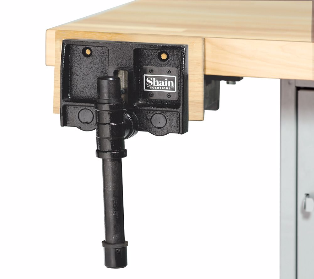 Double faced unit has a cabinet with doors and an adjustable shelf on each side. The locking doors have pulls and are hung on five knuckle institutional hinges. The base of the unit is constructed of solid maple and maple veneers. The 2-1/4" thick top is hard maple. The unit is finished with an earth-friendly UV finish. Unit can be ordered with or without vises. Overall size: 64"W x 54"D x 31-1/4"H.