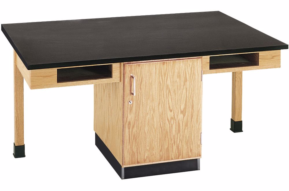 Storage Cabinet Tables are constructed of solid oak and hardwood veneers, this table features a center cabinet with lock, and rubber base molding. This table is available with plain or book compartment aprons and comes in both single (2-student) and double faced (4-student) models. The center cabinet is available with two locking drawers or as a plain base cabinet with adjustable shelf. These tables are designed for use at sitting height. They are finished with a chemical resistant, earth-friendly UV finish. This unit is available with our complete line of top materials to satisfy every requirement or budget.