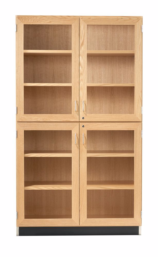Two and four glass door oak display cabinets that are a great addition to the classroom. The top and bottom doors are divided making it easy to segregate your display types. The fixed shelf in the middle creates the ability to lock the top and the bottom doors separately. The right hinged doors have a lock which locks both right and left hinged (with astragal) doors. There is also a fixed bottom shelf and two adjustable shelves in the bottom and top sections each. Each shelf holds 40 lbs. per square foot. 36"W and 48"W units have 1" thick shelves. 24"W cabinets have 1" thick shelves. The display cabinet is made of oak veneers with solid wood framed glass doors. The glass doors are made of 3/16' tempered glass which is designed to crumble when broken, preventing injuries. The oak is finished with a non-emitting UV finish. The cabinet is available in three widths: 24" (two door), 36" or 48"W (four door). Overall dimensions: 22"D x 84"H.