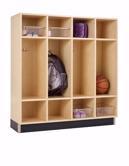 Store backpacks, coats and totes in these sturdy wood lockers. The backpack units are available in oak or maple veneer and contains one section. Each section contains two smaller cubbies and a larger backpack cubby. The locker section has a double hook mounted for hanging jackets and backpacks. The sections are divided with 3/4" veneered plywood and finished with a hard, UV finish. The back is designed to be anchored to a wall for stability. Black rubber base molding gives the locker unit a finished look.