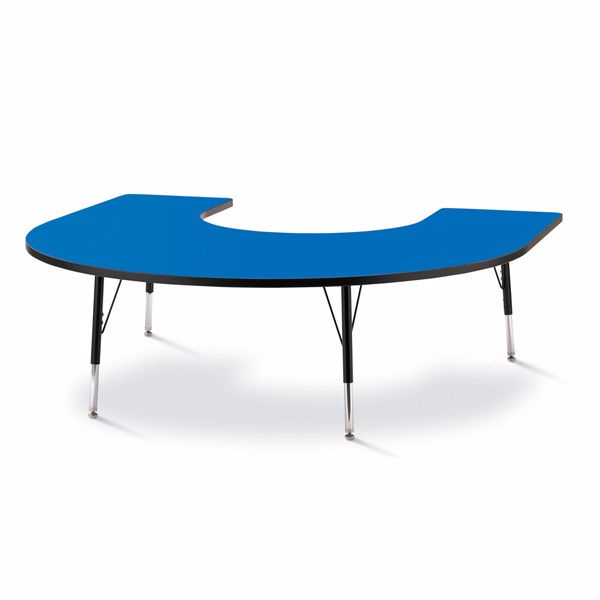 Children can center around an educator easily with horseshoe tables. Accommodates up to 9 chairs. The legs feature glides that reduce noise, prevent snags, and don’t rust. Blue tabletop with black TRUEdge and black legs.