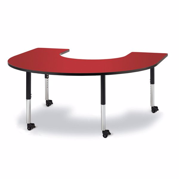 Children can center around an educator easily with horseshoe tables. Accommodates up to 9 chairs. The legs adjust from 20” to 31” high, are 2” thick, and feature heavy-duty casters. Red tabletop with black TRUEdge, black legs, and black casters.