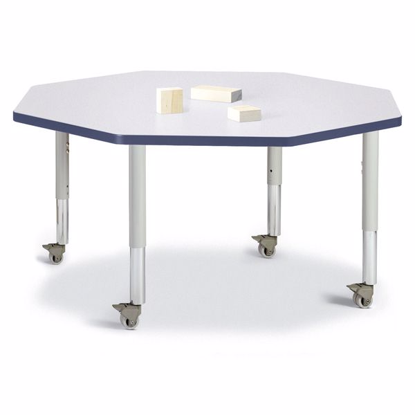 Kids will enjoy learning together while having their own space with the Octagon Table. Accommodates up to 8 chairs. The legs adjust from 20” to 31” high, are 2” thick, and feature heavy-duty casters. Freckled gray tabletop with navy TRUEdge, gray legs, an