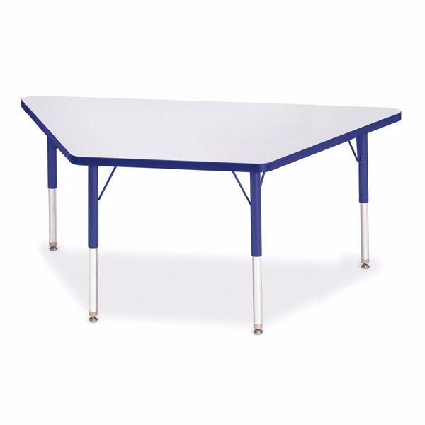 Great for students of any age, multiple trapezoid tables can be arranged in many configurations to accommodate any space. Accommodates up to 5 chairs. The legs adjust from 20” to 31” high, are 2” thick, and feature heavy-duty casters. Freckled gray tablet