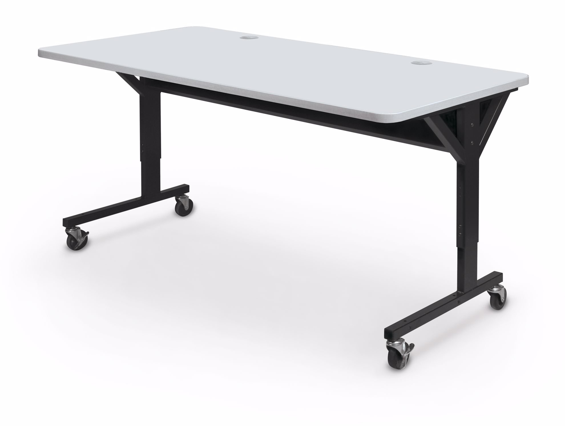 Heavy-duty Brawny Tables are ideal for use in training rooms, classrooms, as workstations, or as general purpose tables for any work area. Height adjustable tables can be set from 25.5" to 33.5" and are available in three widths for unsurpassed versatility. Top is a hefty 1.25" thick scratch-resistant HPL with grommets. Black powder-coated steel frame includes glides and 3" casters (2 locking). Supporting stretcher bar provides superior structural strength and durability, and includes a steel cable management tray that provides additional stabilization. In stock with gray tops. Custom tops available with a longer lead time. Has achieved GREENGUARD GOLD Certification. TAA compliant.