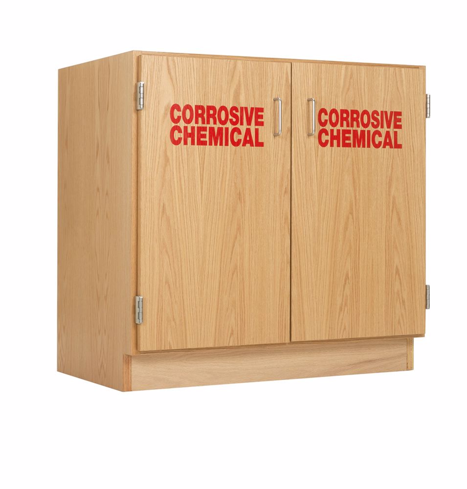 The Corrosive Chemical Storage Cabinet is the solution for storing non-flammable acids and corrosive liquids. This storage cabinet is constructed of 3/4" thick exterior grade plywood with a finished top and lined with a 1/4" polypropylene interior. Included is a removable back panel to access the venting behind the cabinet, 2" plastic containment drip pan, (1) lined adjustable shelf and 96mm pulls. This unit is available in either two doors or single door and is finished in Northwood’s UV finish.