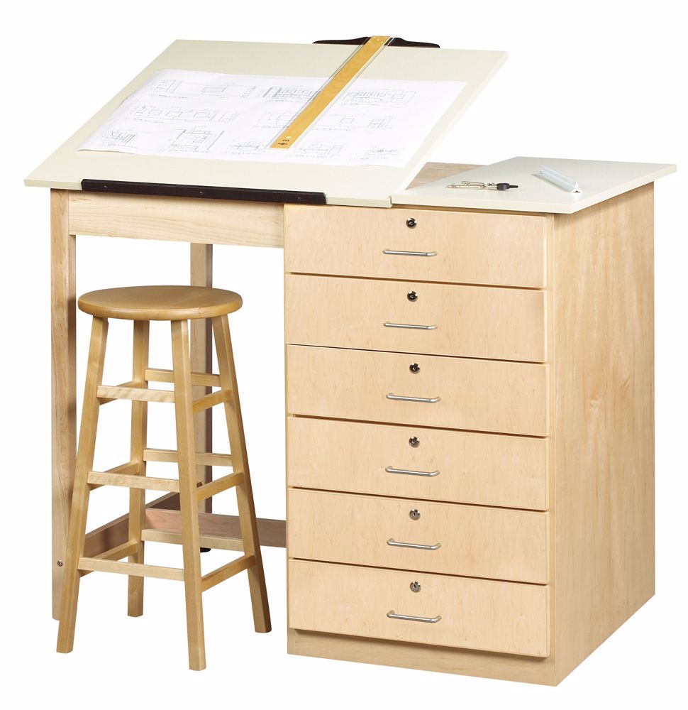 This deluxe unit has a plywood cabinet and solid maple apron and legs. Base includes six locking drawers (20-1/2" x 19-3/4"D), master-keyed separately. The drawers are completely finished and dovetailed on all four sides. The almond colored plastic laminate 2-piece 3/4" top has an adjustable side (33"W x 32-1/2"D) and a flat reference side (15W" x 32-1/2"D). Adjustable side has a pencil stop and includes the soft-close feature. The top adjusts from 0 to 30 degrees. The unit is finished with an earth-friendly UV finish. Overall size: 48"W x 32-1/2"D x 39-3/4"H