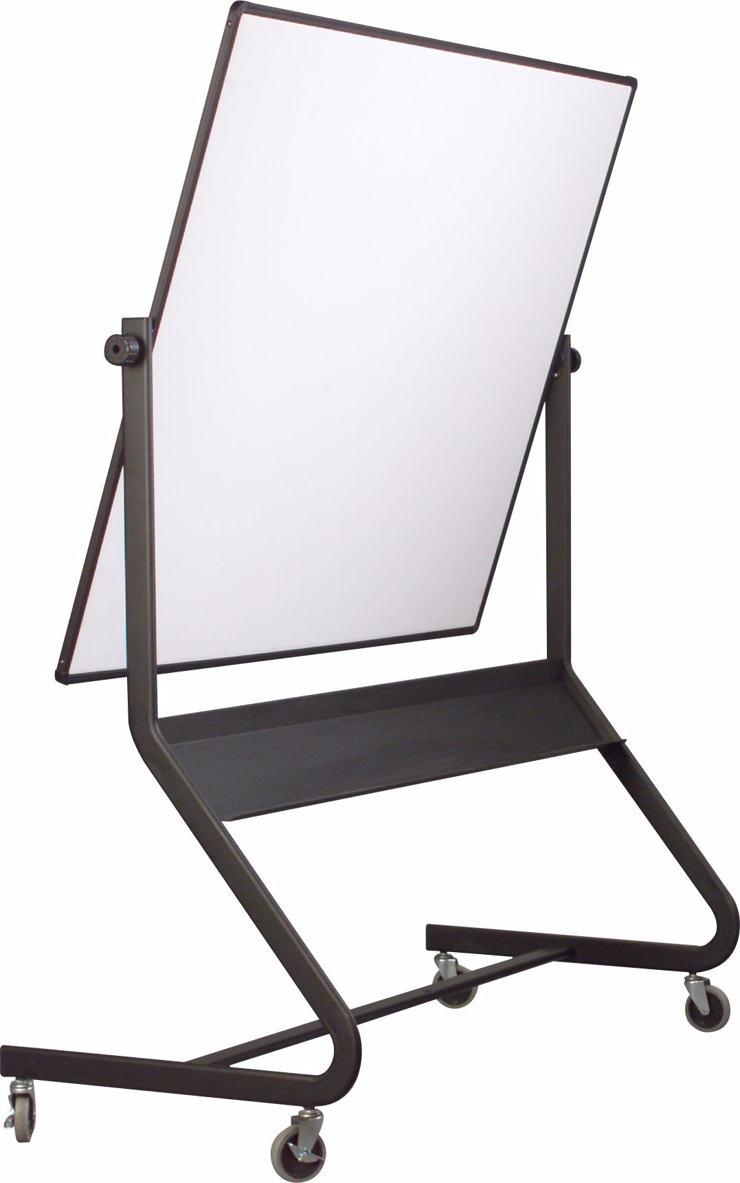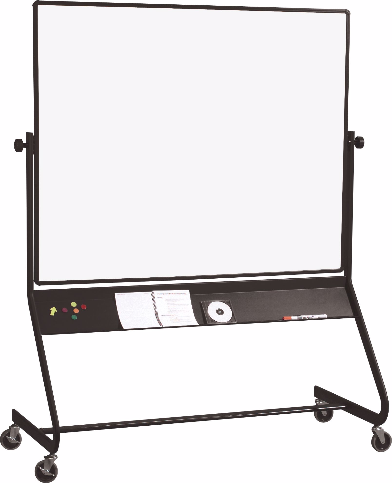 Get up to twice the functional space of a wall-mounted board with a versatile and durable Euro Mobile Reversible Board. • Mobile boards are double-sided and available in a variety of surface combinations, including porcelain steel magnetic dry erase whiteboard, porcelain steel projection board, Dura-Rite HPL dry erase markerboard, and tackable natural cork. • Panel is trimmed with modern black anodized aluminum, rotates 360° on a pivot hinge, and locks into place with the turn of a knob. Trim includes a full-length accessory tray for style and stability. • Available with a panel size of 40"H x 30"W or 4'H x 6'W. Smaller size ships UPS to save you time and money. • Wide base design for stability includes nesting legs, and 4" locking casters.