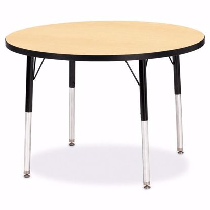 These round tables are excellent for allowing children to interact with each other during projects. Accommodates up to 4 chairs. The legs feature glides that reduce noise, prevent snags, and don’t rust. Maple tabletop with black TRUEdge and black legs.
