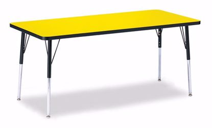 The perfect table for any occasion. Accommodates up to 10 chairs. The legs adjust from 20” to 31” high, are 2” thick, and feature heavy-duty casters. Yellow tabletop with black TRUEdge, black legs, and black casters.