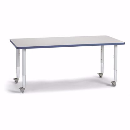The perfect table for any occasion. Accommodates up to 8 chairs. The legs adjust from 20” to 31” high, are 2” thick, and feature heavy-duty casters. Freckled gray tabletop with blue TRUEdge, gray legs, and gray casters.