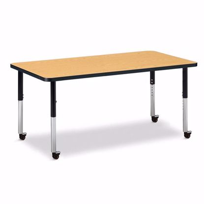 The perfect table for any occasion. Accommodates up to 8 chairs. The legs adjust from 20” to 31” high, are 2” thick, and feature heavy-duty casters. Oak tabletop with black TRUEdge, black legs, and black casters.