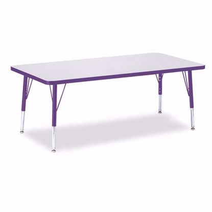 The perfect table for any occasion. Accommodates up to 8 chairs. The legs adjust from 20” to 31” high, are 2” thick, and feature heavy-duty casters. Freckled gray tabletop with purple TRUEdge, gray legs, and gray casters.