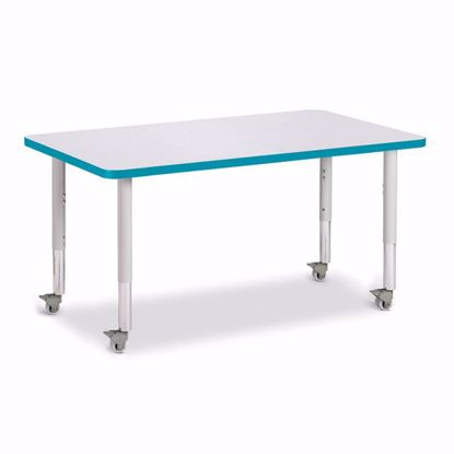 The perfect table for any occasion. Accommodates up to 6 chairs. The legs adjust from 20” to 31” high, are 2” thick, and feature heavy-duty casters. Freckled gray tabletop with teal TRUEdge, gray legs, and gray casters.