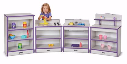The adapted 20” counter-height of this kitchen allows curious toddlers to enjoy kitchen play. Features like the four "burner" stove, wooden turn-button controls, and button display makes for realistic play. The door-free construction provides maximum safety of little ones. Features freckled-gray laminate and purple TRUEdge®.