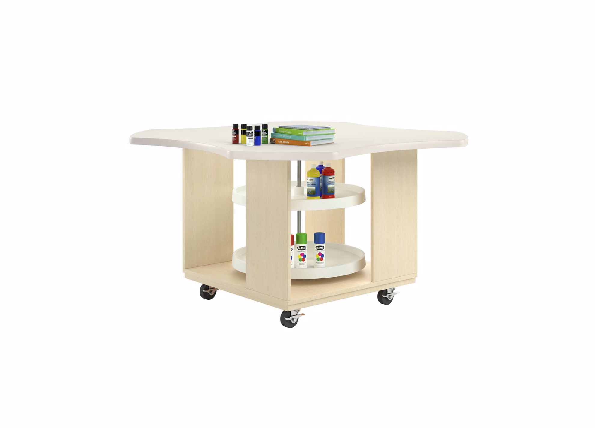 The Intermix Workstation fosters collaboration and encourages productivity! Created of solid maple veneers and finished with a chemical resistant, earth-friendly UV finish. These mobile units come with 4" locking casters for ease of use. All units have a 60" high-pressure laminate top, available in a variety of color options. The Lazy Susan model has two independent turntables encased in a 30"W x 30"D cabinet. 36" high.