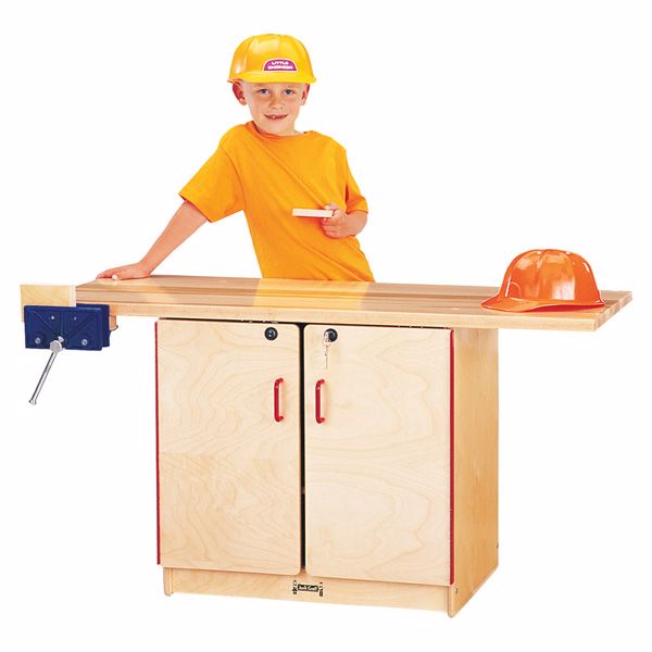 Kids can secure their favorite tools in the KYDZHinged lockable cabinet doors while building new "projects" on the Maple workbench top. Two colored tubs and one 6" vise is included, with pre-drilled holes for one additional vise. The worktop is 19" wide x 1" thick x 46" long.