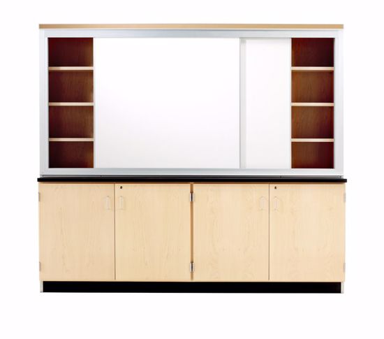 Provides you with a way to present to your class, but also provides you with ample storage for all your classroom activities. This unit measures 96"W x 24"D x 84-1/2"H and includes 2-4' sliding porcelain marker boards. Directly above the marker board is a map rail, which extends the width of the unit. The porcelain marker boards are magnetized as well. Behind the sliding marker boards are three adjustable shelves. The lower storage cabinets contain one adjustable shelf and both units lock. Available in Maple and Oak.