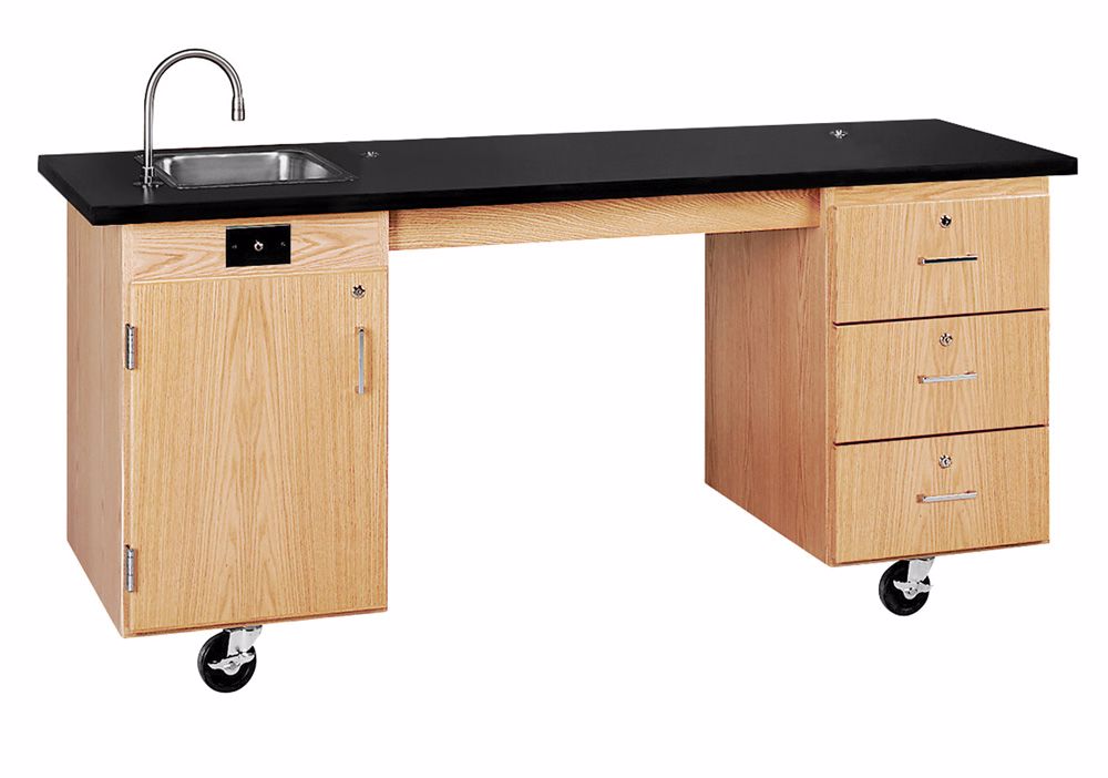 Perfect for the physically impaired or for classroom demos. Constructed of solid oak, hardwood and oak veneers with a chemical resistant, earth-friendly UV finish. The 1-1/4" ChemGuard top is supplied with or without a stainless steel look sink, toggle switch water pump, two 2-1/2 gallon supply and waste containers, GFI AC duplex receptacle with inlet socket, 25' extension cord, two rod sockets, two each 3/4" diameter x 36" long upright rods, 1/2" x 40" crossbar and two rod clamps. With a mobile capacity of 500 lbs. it rolls easily on 4" ball-bearing swivel casters with brakes. Dovetailed drawers are constructed of plywood and ride on epoxy coated glides. Cupboard door and drawers have locks. Wheelchair accessible from two sides, measures 32"W x 29"H. Inside drawers measure: 14.5"W x 19"D x 6"H. Dimensions: 72"L x 24"D x 33"H. Weight: 240 lbs.