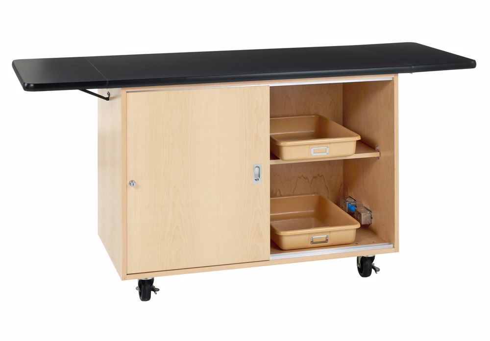 Constructed from select maple and maple veneers with a chemical resistant, earth-friendly UV finish. It features unbreakable aluminum sliding door glides and lock. Edges of the 1-1/4" thick high-pressure laminated top are bound with a Plastic-T Molding. Includes an inlet and duplex outlet, 25' extension cord and two adjustable shelves. With a mobile capacity of 500 lbs. Extended Top: 72"W x 24"D. Weight: 230 lbs.