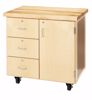 Store small items in the three drawers and larger items in the larger cabinet area with one adjustable shelf. The unit is constructed of solid maple and maple veneers and features a 1/4" pegboard on the right side of the unit for mounting tools (includes nine hooks). Rolls easily on 4" locking swivel casters. Your choice of a 1-1/4" ChemGuard top or 1-3/4" maple top.
