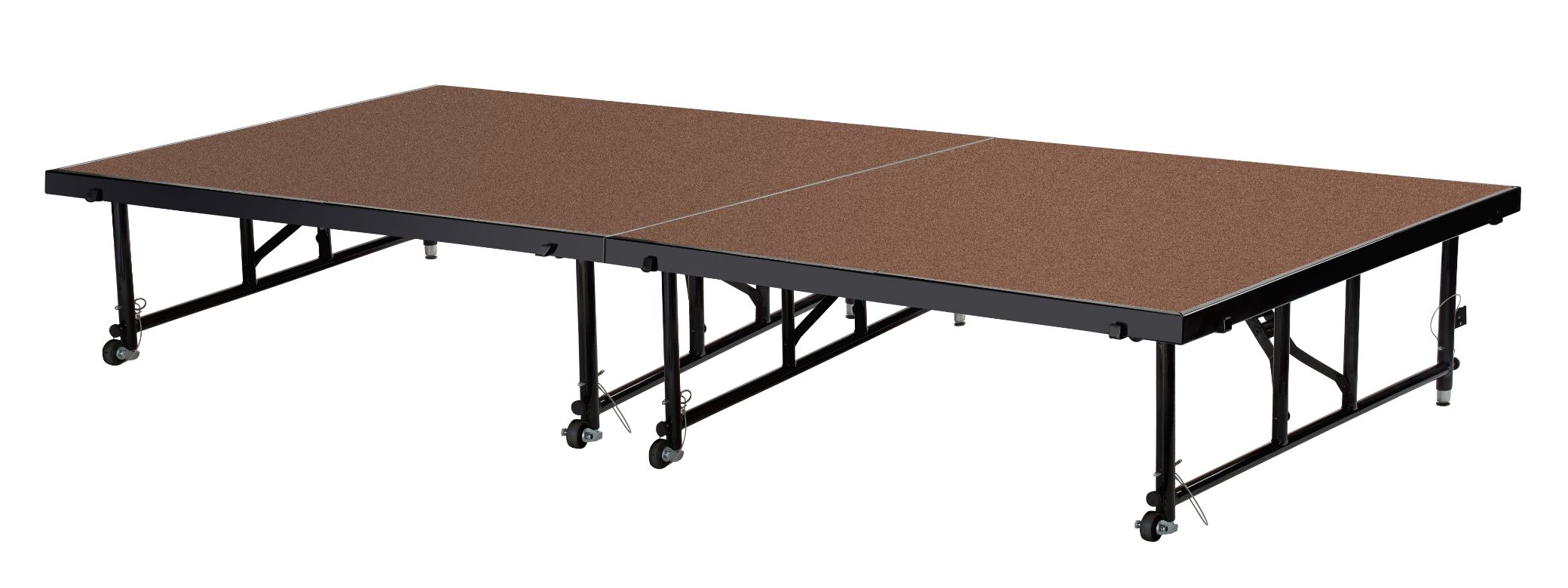 The Transfix is an expansion to our popular performing arts line of stages featuring 4’x4’ sized platforms that are height adjustable from 16-24” or 24-32”, and roll on caster wheels. Available in both hardboard and a variety of carpeted surfaces, these new lighter weight portable platform pieces are the perfect solution for when one person will be doing the setup. Roll to desired location on built in caster wheels and gang together multiple platforms to create large or small stages of your choosing.