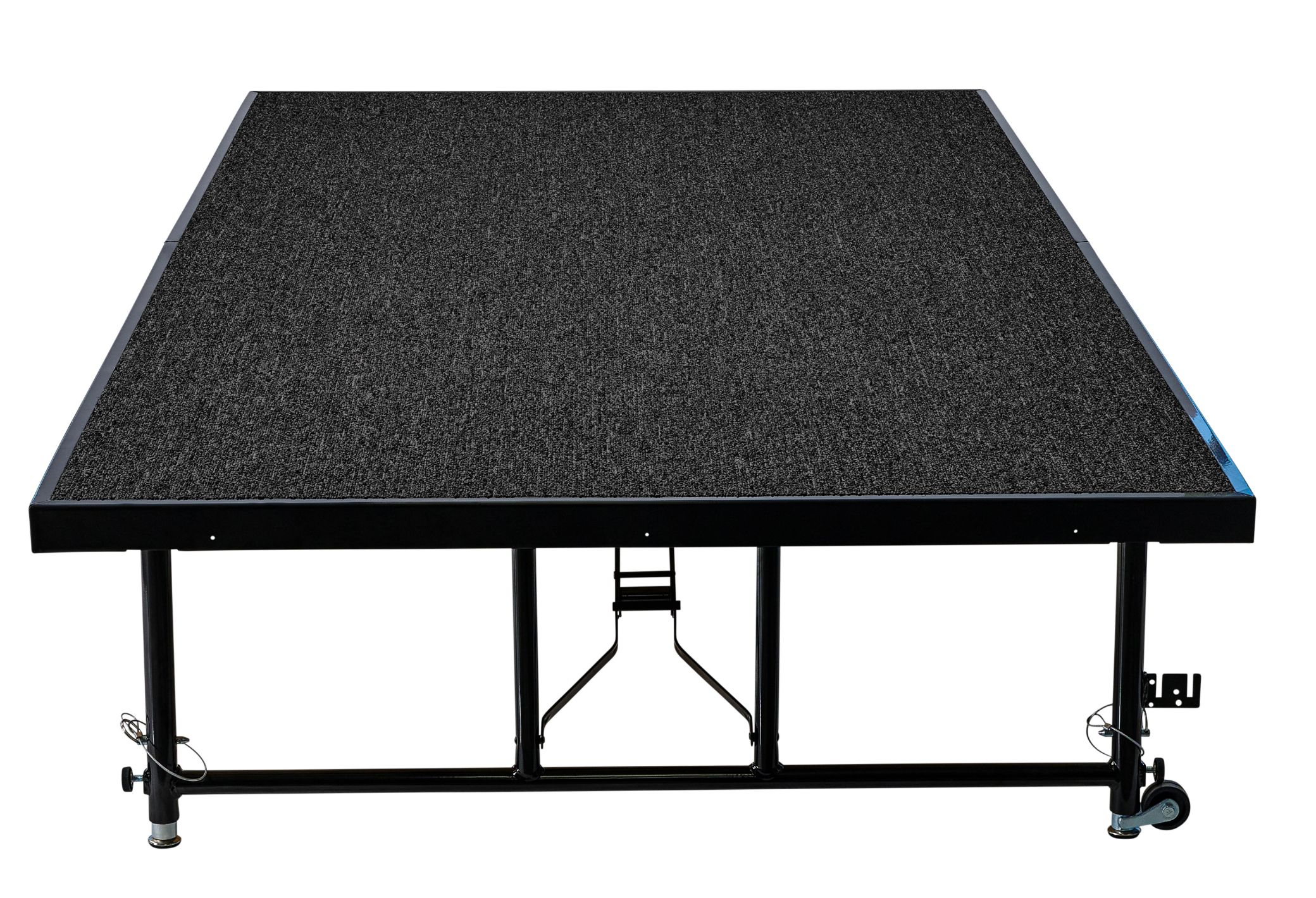 The Transfix is an expansion to our popular performing arts line of stages featuring 4’x8’ sized platforms that are height adjustable from 16-24” or 24-32”, and roll on caster wheels. Available in both hardboard and a variety of carpeted surfaces, these new lighter weight portable platform pieces are the perfect solution for when one person will be doing the setup. Roll to desired location on built in caster wheels and gang together multiple platforms to create large or small stages of your choosing.