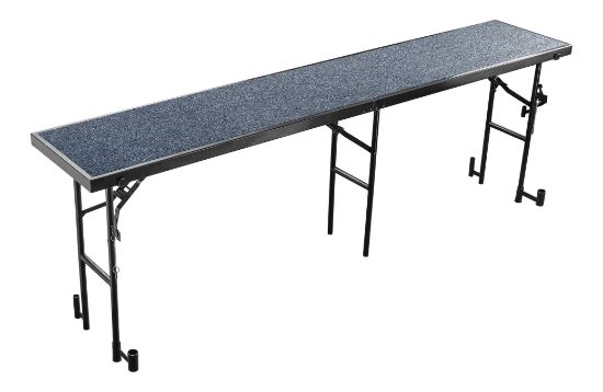 Rise to the occasion! The NPS Straight Carpeted Standing Riser is the reliable and affordable choice for your school performances and assemblies. Users are supported by a heavy-duty, 16-gauge steel, black powder-coated frame. The premium 3/4" thick plywood deck is durable and features a firmly-affixed carpeted surface. Legs are constructed with 14-gauge steel tubing and feature simple and safe spring-loaded locking mechanisms allowing for quick set-up assembly and folds up easily for manageable portable storage. The stage offers a secure weight capacity of over 200 lbs. per square foot. High-impact plastic glides will ensure floors are protected from damage. Firmly welded ganging devices let users combine equal-height stages to create a large single stage platform or assemble different sizes to create standing riser configurations. Ships fully assembled.