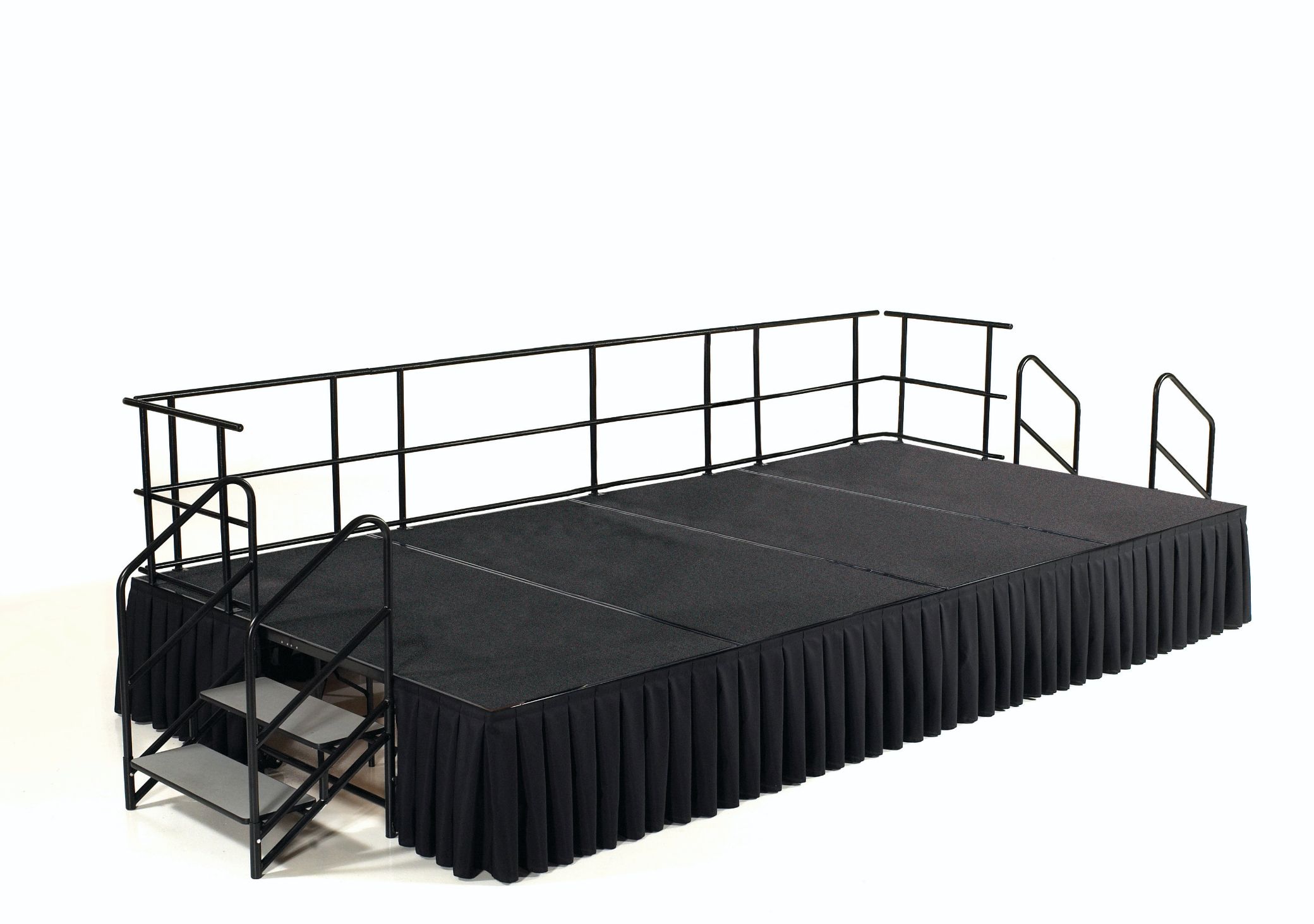 The NPS Portable Carpeted Stage Group is the reliable and affordable choice for your school performances and assemblies. Users are supported by a heavy-duty, 16-gauge steel, black powder-coated frame. The premium 3/4" thick plywood deck is durable and features a firmly-affixed carpeted surface. Legs are constructed with 14-gauge steel tubing and feature simple and safe spring-loaded locking mechanisms allowing for quick set-up assembly and folds up easily for manageable portable storage. The stage offers a secure weight capacity of over 200 lbs. per square foot. High-impact plastic glides will ensure floors are protected from damage. Firmly welded ganging devices let users combine equal-height stages to create a large single stage platform or assemble different sizes to create choral or band riser configurations. This set includes two stage steps, 14-gauge guardrails for extra safety, and skirting for an elegant look.