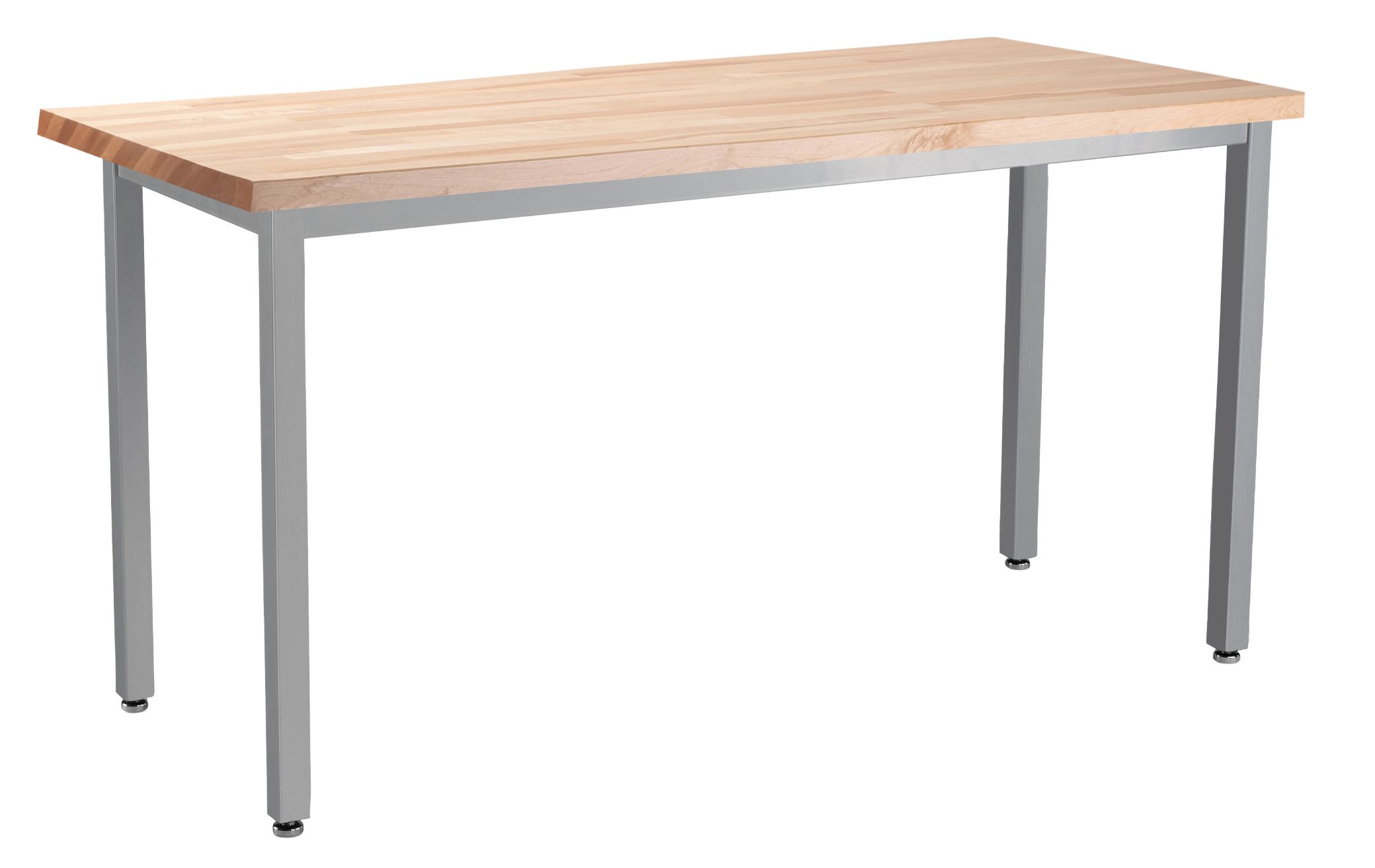 The NPS Heavy Duty Table with Butcher Block Top is the ideal working table for Makerspaces and STEM Labs. The Butcher Block top is made from 1.75” thick Maple wood coated with a urethane-based satin finish to prevent permanent stains. Maple top absorbs sound and impact, making for a safe learning environment. 16 gauge steel frame apron and 14 gauge legs make this table virtually indestructible. The 11 gauge steel tabletop support tabs and corner brackets fuse as one with 4 heavy-duty tamper-free Loctite hex screws. The steel legs feature a supreme dual connection. The (12 gauge) leg-base is fastened to the tabletop with 4 heavy-duty screws which gets inserted into the frame using a strong welded hangar bolt. Legs connect to the frame corner brackets with industrial-grade nylon-insert lock nuts. All legs come standard with simple-adjust glides with optional caster/gusset kits. Durable wood and hard work come together in the NPS Butcher Block Top Heavy Duty Table.