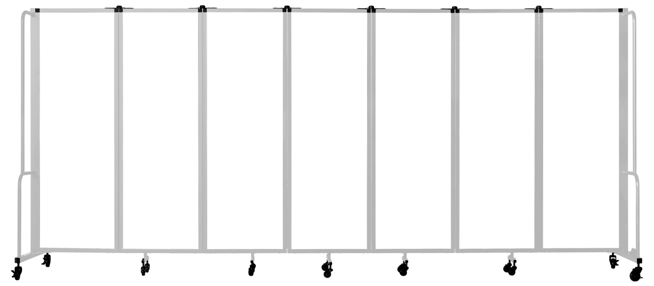 Divide your multipurpose room, medical center or house of worship with the ultimate partition: the durable, flexible and portable Robo™ dividers. Room to room transportation is made simple with full length handles and spring enhanced casters that glide right over thresholds and uneven flooring. They feature Tech-Lock brakes at both ends for a secure stop. Our portable dividers are made with steel, aluminum-framed panels and can be ganged together with magnet connectors built into the divider ends. Dividers are available in PET, clear acrylic, frosted and whiteboard panels. They stand 6 ft tall and come in four lengths. Go green with the environmentally-friendly PET divider, made with 100% recycled materials. The PET panels dampen sound, so outside distractions won’t stand a chance. Or go with our clear acrylic Robo™ dividers to see and hear it all while maintaining a distance. The acrylic panels are crafted with lightweight, non-yellowing OPTIX® acrylic, a highly durable material that resists intense force or shock. Dividers are available in either black or grey frames. Robo™ – Robust. Easy. Portable.