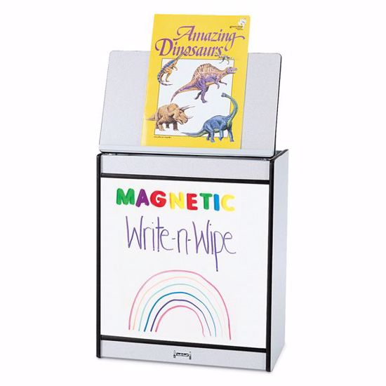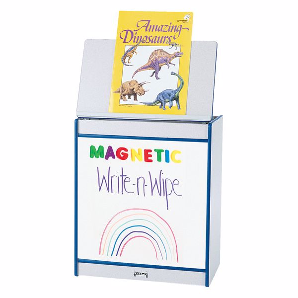 A Big Book language enrichment station on wheels! Easel folds down over storage space when not in use. Magnetic Write-n-Wipe front for adding to your story. Vertical big book partitions in back for storing a multitude of books. Overall approximately 43" high.