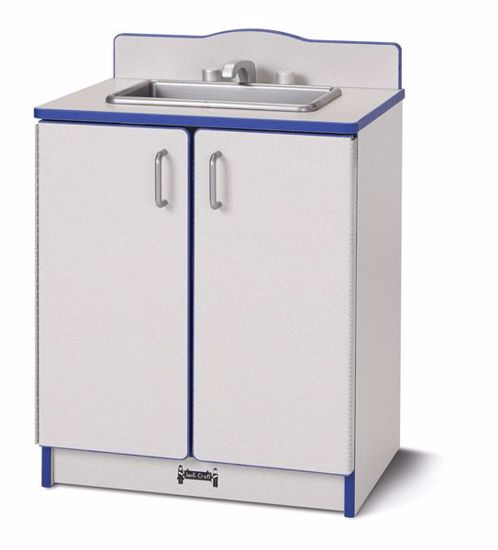 Inspire budding chefs with this kitchen sink. Magnetic catches help keep doors closed while chrome-looking handles and faucet provide a high-end aesthetic. Wooden turn-button controls and swivel faucet makes for realistic play. Counter is 23.5” high. Features freckled-gray laminate and red TRUEdge®.
