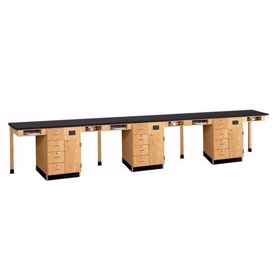 Single faced tables that provide a fully equipped science center from two to eight students. Each unit is constructed of solid oak, and hardwood veneers. The single faced units contain a solid epoxy resin sink (12" x 8" x 6"H) along with cold water faucets for every two students. Every unit contains enough gas cocks for each student along with GFI AC duplex electrical receptacles, rod sockets and book compartments. All units contain locks for the drawers and doors. Choose from models with a full cupboard only or a half cupboard and dovetailed drawers. Can be ordered without sink, fixtures and rod sockets. They are finished with a chemical resistant, earth-friendly UV finish. Single face two-student unit measures 66"L x 30"W x 36"H. Add 66" in length for each additional two students. Your choice of 1" epoxy resin or 3/4" phenolic resin tops.
