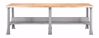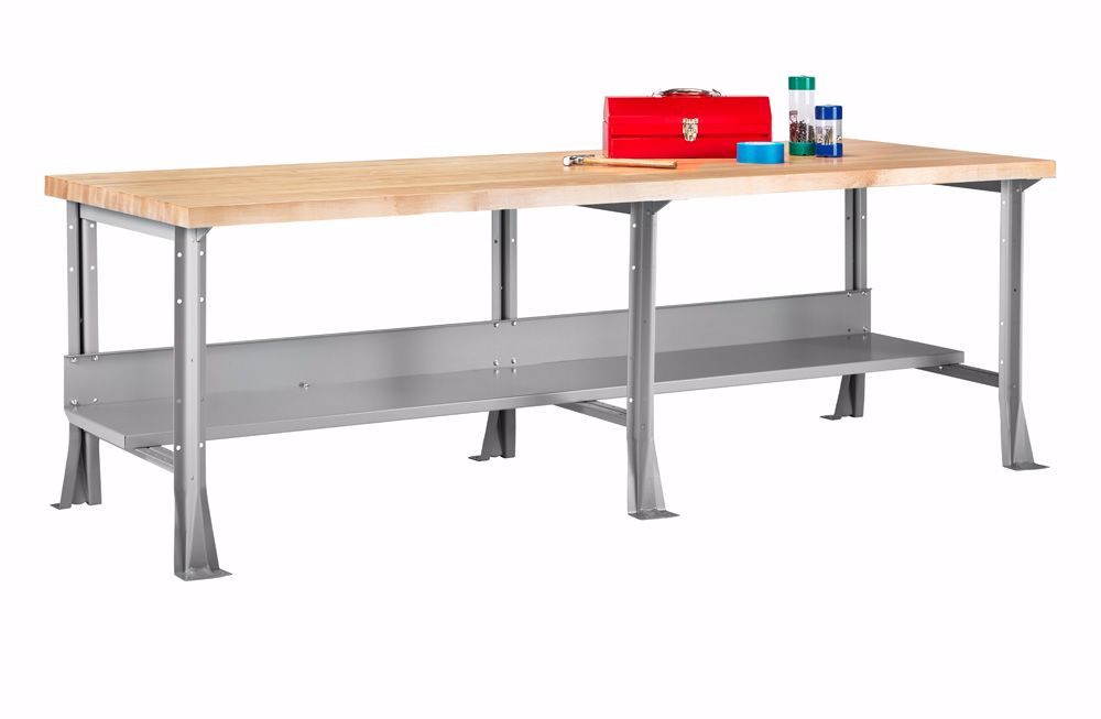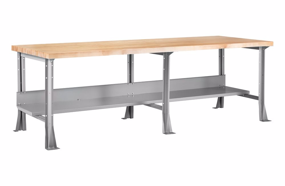 Constructed of heavy Gauge steel members which can be combined in a number of ways using any one of 3 tops, lower shelf, back and end stops. A wide variety of sizes is possible. Legs are welded construction with floor feet and include a three quarter deep lower shelf and rear stringer. Color: gray. Choice of three tops include: 1) 12 gauge steel top wrapped over 2" thick core, 2) 1-3/4" Maple top, 3) 2-1/4" Maple top. Height varies with top selected.