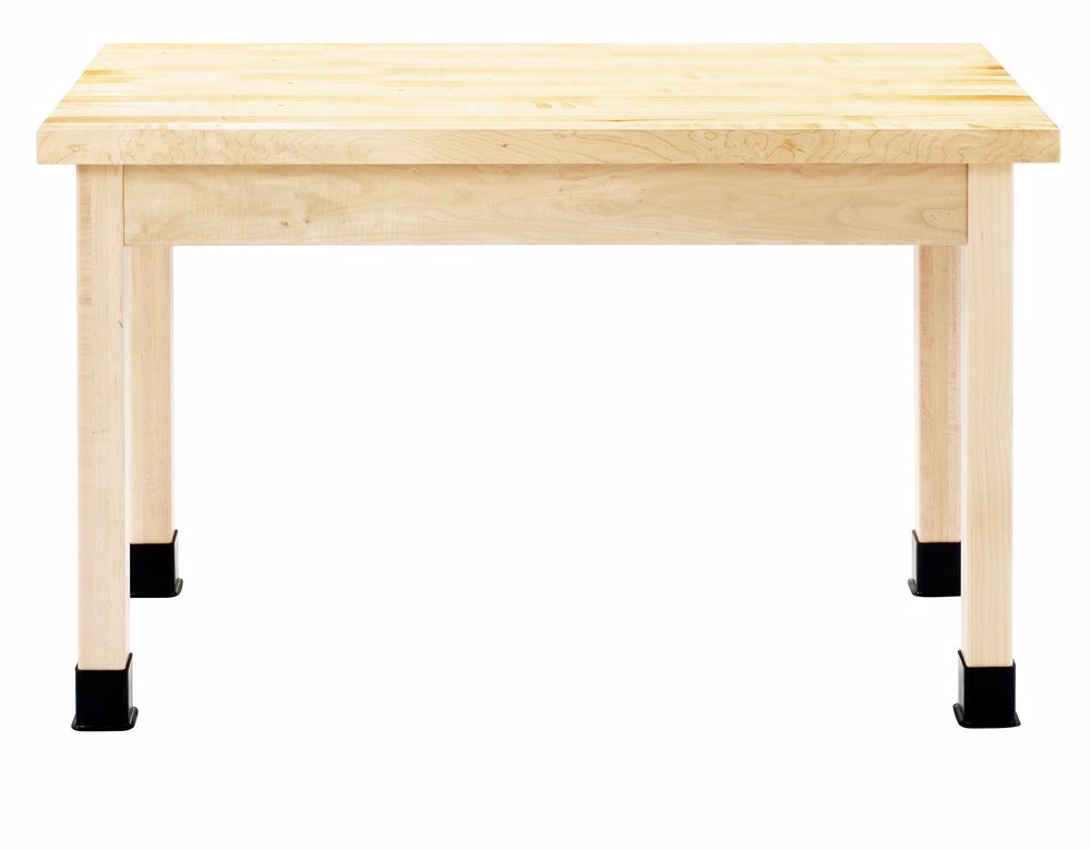 Available in a variety of sizes, with several different top materials. Constructed of solid maple and finished with an earth-friendly UV finish. Aprons are constructed of solid maple and are 13/16"D x 4-1/2"H with heavy-duty 13-gauge steel corner braces. The unit has solid 2-1/4" maple legs with 5/16" hanger bolt installed, and are attached to the table with nuts and washers (supplied). All tables include leg boots and levelers. Choose from plain or book compartment apron. Standard height is 30"H. Other sizes and options are available, call for more information. (Shipped KD with tops attached)