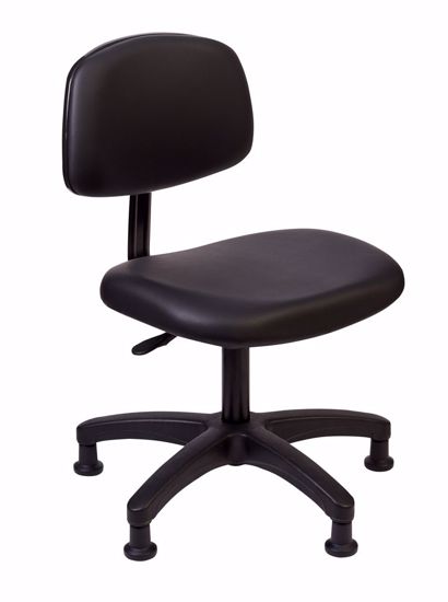 Formed to fit you—our ergonomic vinyl upholstered chairs feature a contoured waterfall seat cushion and an adjustable back rest with lumbar support for increased comfort. Upholstery color: Black. They easily adjust in height with a smooth pneumatic circle adjustment range of 18" - 23"H. They come standard with black non-marring glides, but optional non-locking casters are available with a weight capacity of 300 lbs. All backed by a 15-year warranty—lifetime on the pneumatic lift.