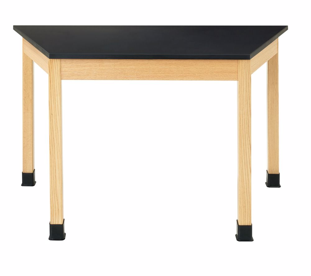 This unique shaped science table allows for flexibility. Use as a two student table or have two or more tables together for group work. The sturdy construction ensures that moving the table won't cause problems. The tables are made of solid oak or maple aprons, 2-1/4" solid legs and have a steel frame supporting the apron. The wood is finished with a chemical resistant, non-emitting UV Finish.
