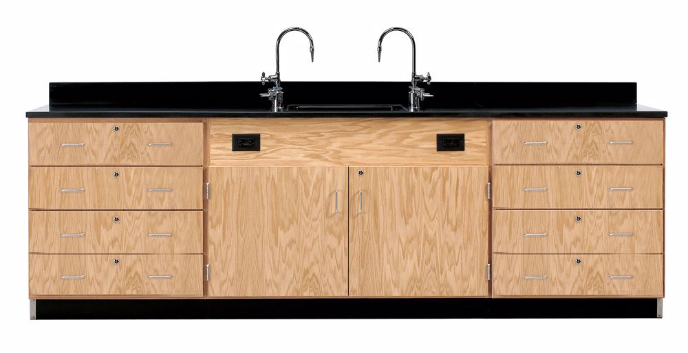 Need all your services in one place or looking to add a wall of cabinets that include services? The Wall Service Bench offers storage and services all in one unit. Constructed of solid hardwood and oak veneer plywood. The Wall Service Bench features your choice of a 1" solid epoxy resin or phenolic resin top with a 18"W x 15"D x 11"H epoxy resin sink and two combination cold water/gas fixtures. The sink area allows access to the plumbing and provides a large storage space with two GFI protected AC duplex electrical outlets. There is enough room in the sink area to allow two 24"D tables to be butted against the unit for use as a peninsula work area. The outer ends of the unit offer four storage solutions: Doors with Adjustable Shelves, Doors/Drawer Combination w/1 Adjustable Shelf, 4 Drawers/doors w/1 Adjustable Shelf and 4 Drawers. All drawers and doors have locks and ADA compliant pulls. The unit is finished with a chemical resistant, earth-friendly UV finish and includes rubber base molding. Dimensions: 108"L x 24"D x 36"H.